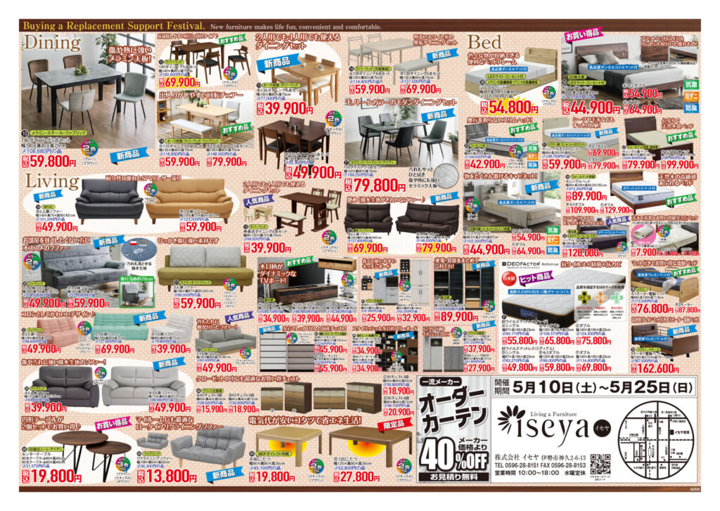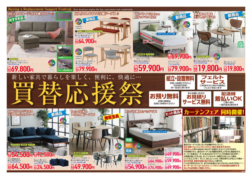 新着情報 買替応援祭😊 2025年5月6日 by iseyakagu / 0件のコメント ゴールデンウィークも終わり、季節も春から夏に向かうこの時期にワクワクを応援! 特典紹介 ①組立・設置無料 ②フェルトサービス(ご希望の方へ椅子の脚にフェルトを貼ります) ③ご入り用時まで、お預り無料 ④まとめ買いお見積りサービス無料 ⑤配送時着払いOK チラシ掲載商品以外にもお値打ちな商品が数多くございます。 カリモクコーナーも増設しましたので、皆様のご来店を心よりお待ちしております。