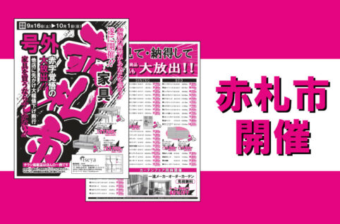 安値の衝撃があなたを襲う!!赤札市遂に開催!! 開催期間:9月16日(土)~10月1日(日) 赤字覚悟の大放出!!他店に先がけ大幅値下げ断行!家具を買うなら今しかない!!!! チラシ掲載品は、ほんの一...