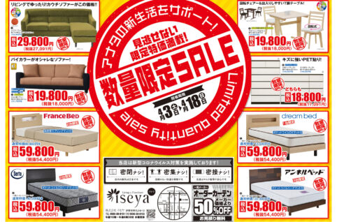 数量限定セール!!見逃せない限定特価満載! 開催期間 4月3日(土)▶4月18日(日) 今回のセールの目玉は一流メーカー品のベッド。アンネルベッド・Serta・dream bed・・FranceBed...