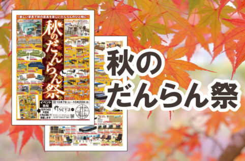 お知らせ…10/7(土)・8日(日)は伊勢まつりの交通規制がありますので、ご確認の上ご来店ください(伊勢広報より) ~新しい家具で秋の夜長を楽しいだんらんのひと時に~ 秋のだんらん祭り 開催期間:10...