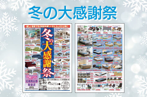 ~新しい家具で冬の夜長を楽しいだんらんのひと時に~ 冬の大感謝祭 開催期間:11月18日(土)~11月30日(木) 師走も近くなって来ました。年内の配達枠がいっぱいになりつつありますので、お正月に家具...